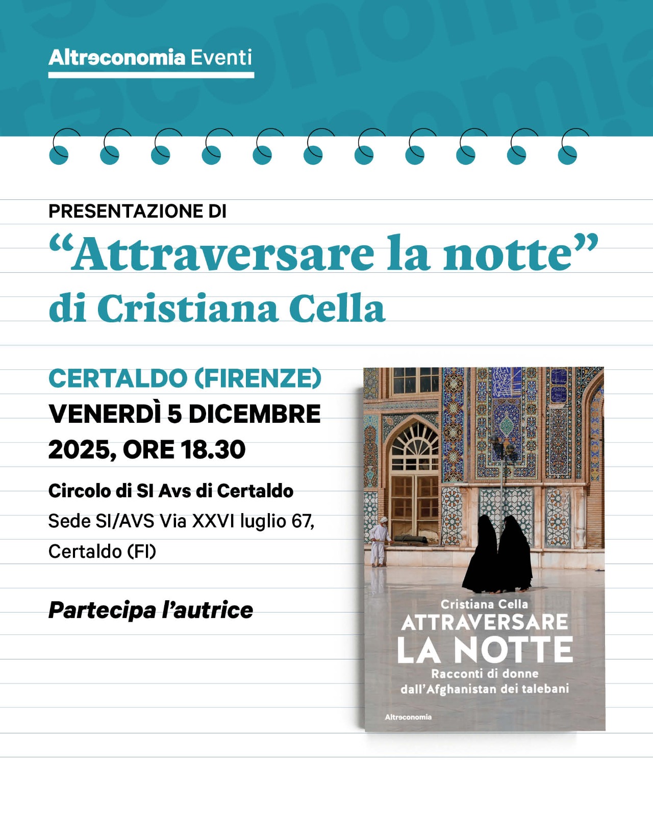 Attraversare la Notte:18:30 18:30 5 Dicembre 2025 Racconti di donne dall’Afghanistan dei talebani Presentazione del libro di e con Cristiana Cella Di Cisda Scarica la Locandina – Certaldo 5 Dicembre Certaldo – Sede di SI AVSVia XXVI Luglio 67Certaldo, Firenze Visualizza luogoMappa Certaldo – Sede di SI AVS Dettagli Evento: {title} Vedi il calendario completo