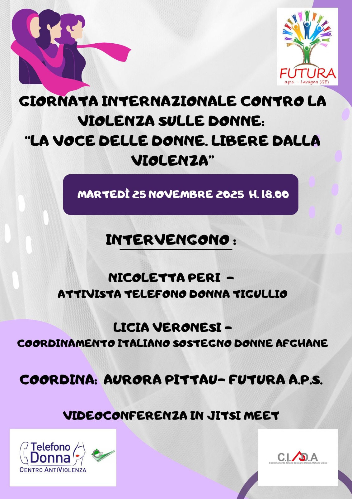 La voce delle donne libere dalla violenza:18:00 18:00 25 Novembre 2025 Videoconferenza in Jitsi Meet Intervengono Nicoletta peri Telefono donna Tigullio Licia Veronesi di Cisda – Coordina Aurora Pittau di Futura Scarica la Locandina – 25 Novembre 2025 Dettagli Evento: {title} Vedi il calendario completo
