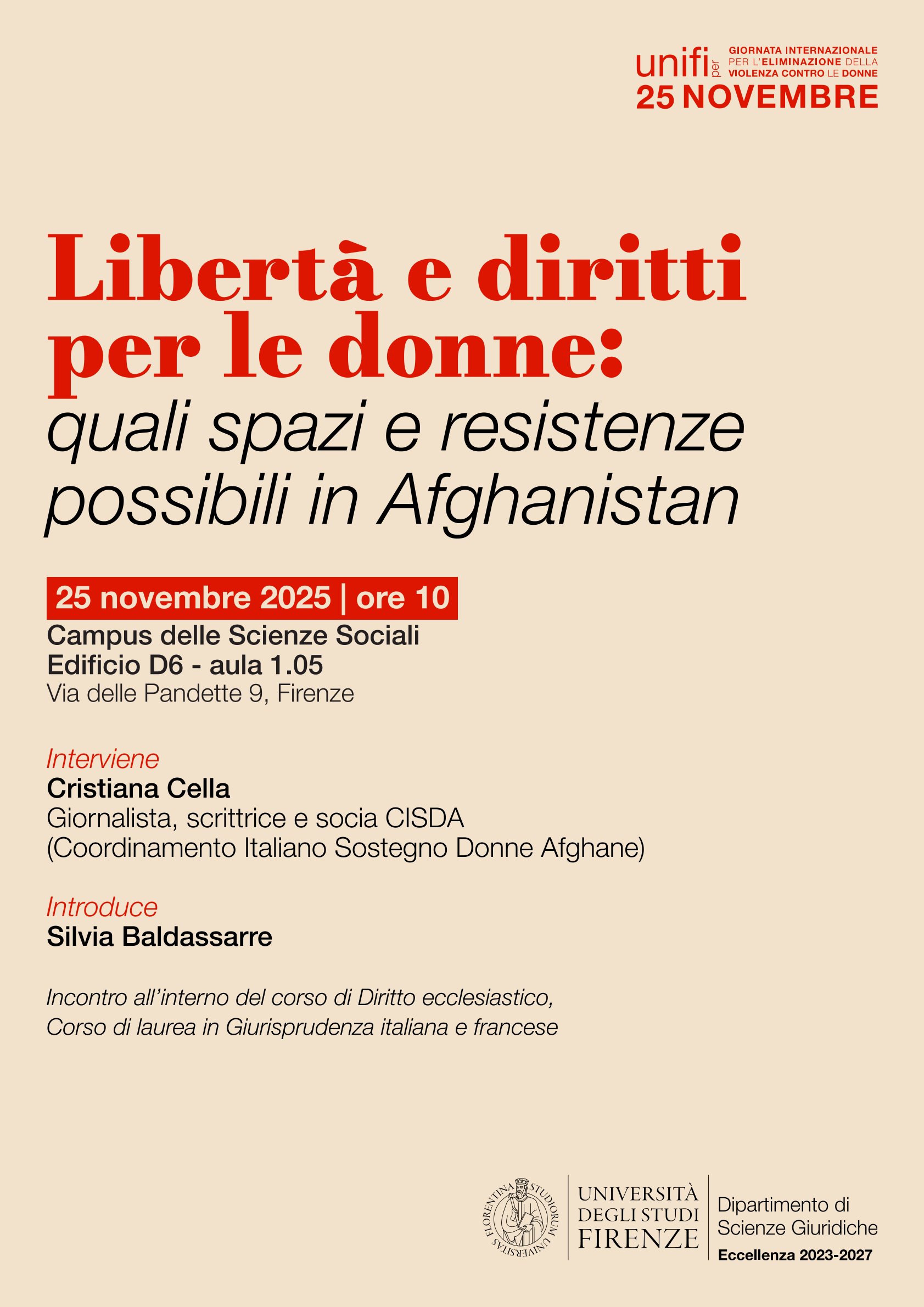 Libertà e Diritti per le Donne:10:00 10:00 25 Novembre 2025 Quali spazi e resistenze possibili in Afghanistan Interviene Cristiana Cella di Cisda Introduce Silvia Baldassarre Scarica la Locandina – Firenze 25 Novembre 2025 Firenze – Campus delle Scienze Sociali Edificio D6 Aula 1.05Via delle Pandette 9Firenze, Visualizza luogoMappa Firenze – Campus delle Scienze Sociali Edificio D6 Aula 1.05 Dettagli Evento: {title} Vedi il calendario completo
